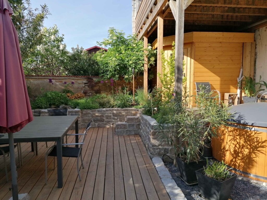 Die großzügige Terrasse wurde aus sibirischer Lärche gefertigt. Das Holz überzeugt nicht nur durch seine natürliche Optik, sondern auch durch Witterungsbeständigkeit und Haptik. Zusammen mit den Muschelkalk-Mauersteinen ergibt sich ein stimmiges Bild – warm, harmonisch und zeitlos.