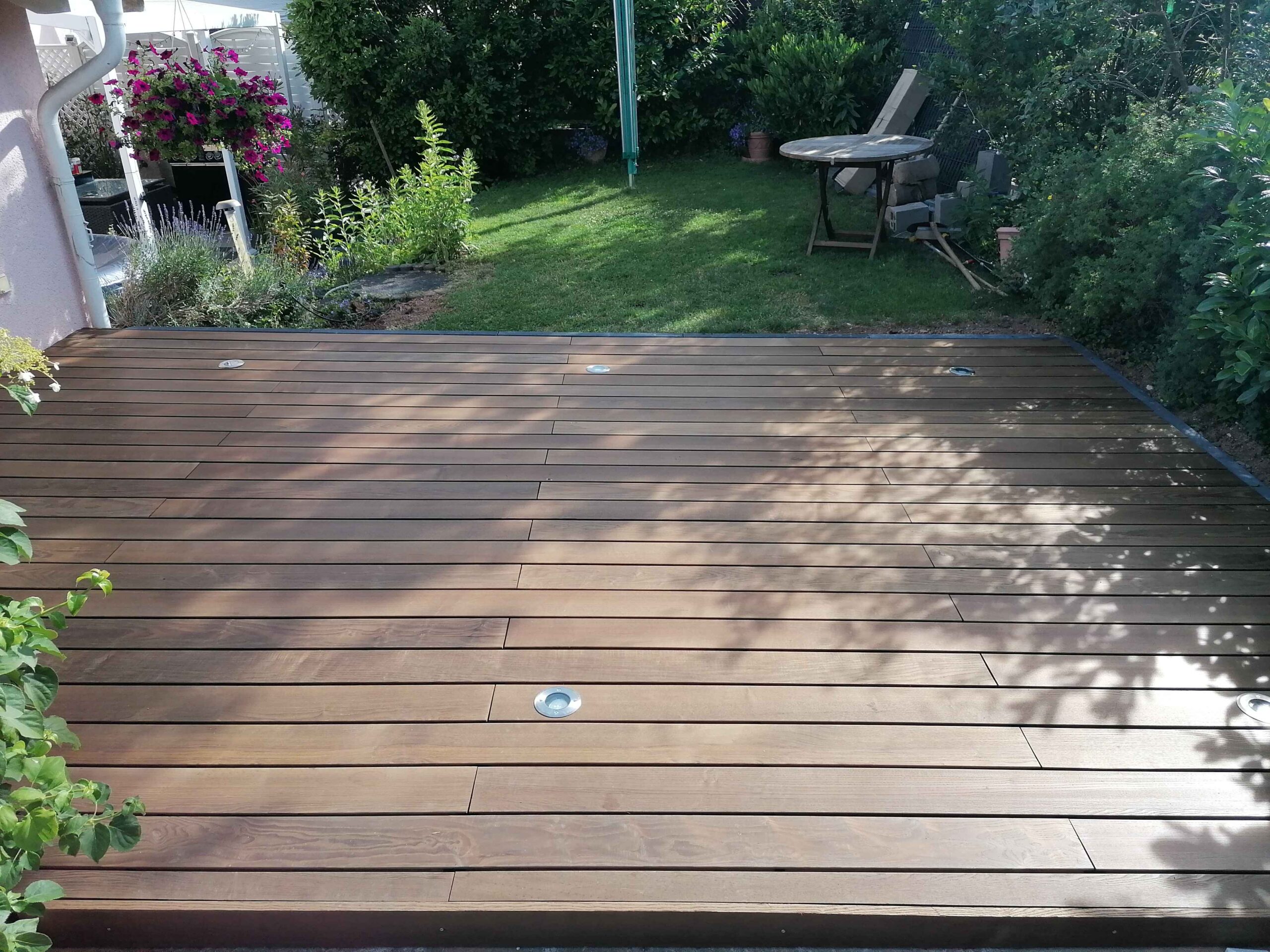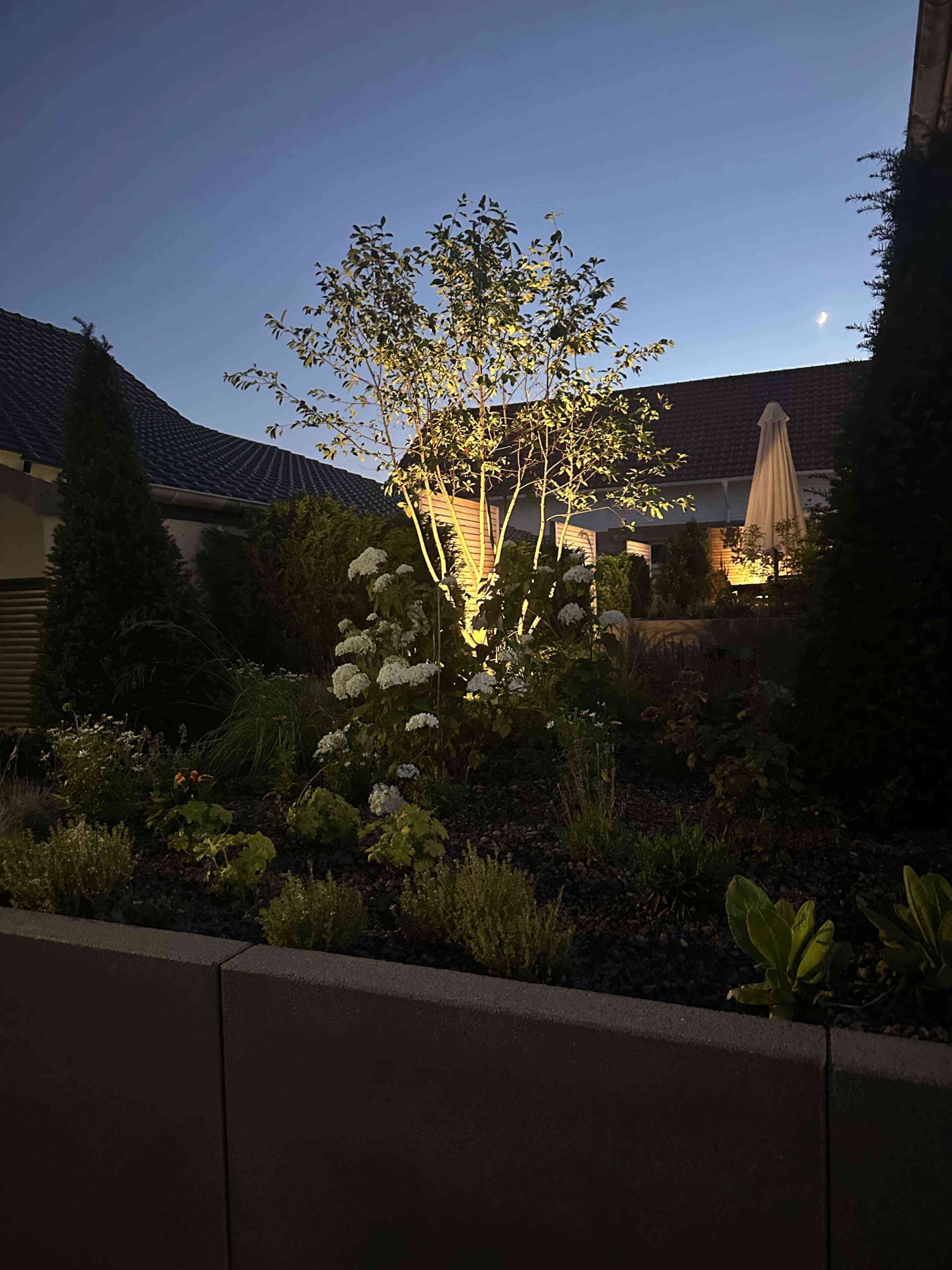 Licht für Atmosphäre – integrierte Beleuchtung mit WirkungIn die Holzterrasse und Pflanzbeete eingelassene Leuchten setzen gezielte Lichtakzente. Sie schaffen einstimmungsvolles Ambiente bei Dunkelheit und lassen den Garten auch in den Wintermonaten lebendig wirken. Die Beleuchtung betont die Gestaltungslinien und sorgt für Orientierung und Stimmung zugleich.