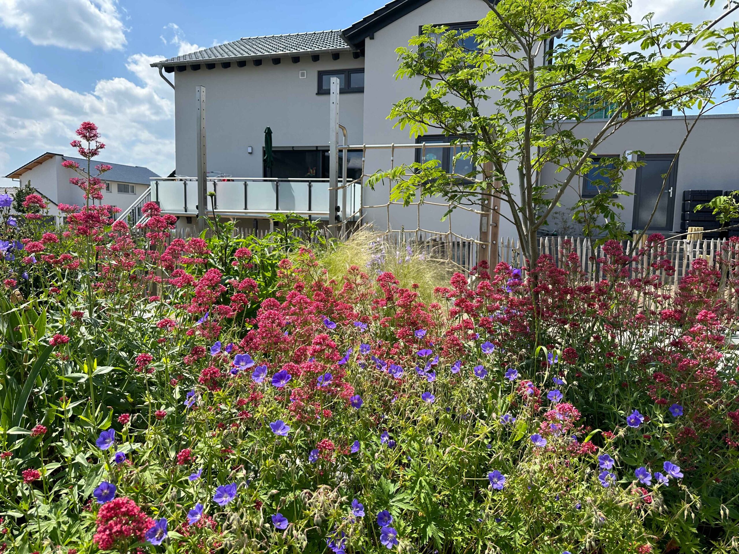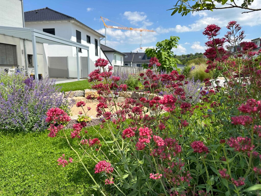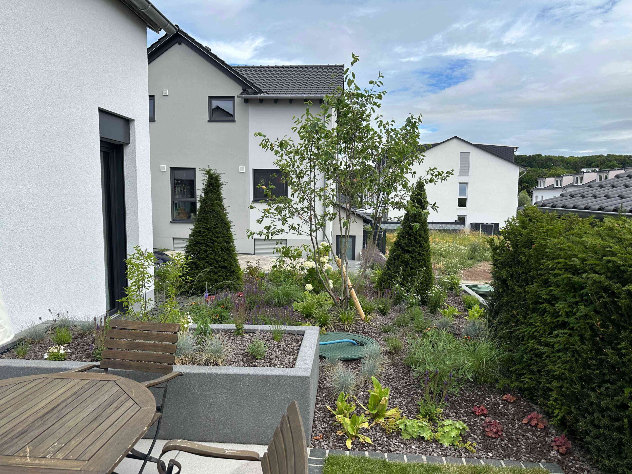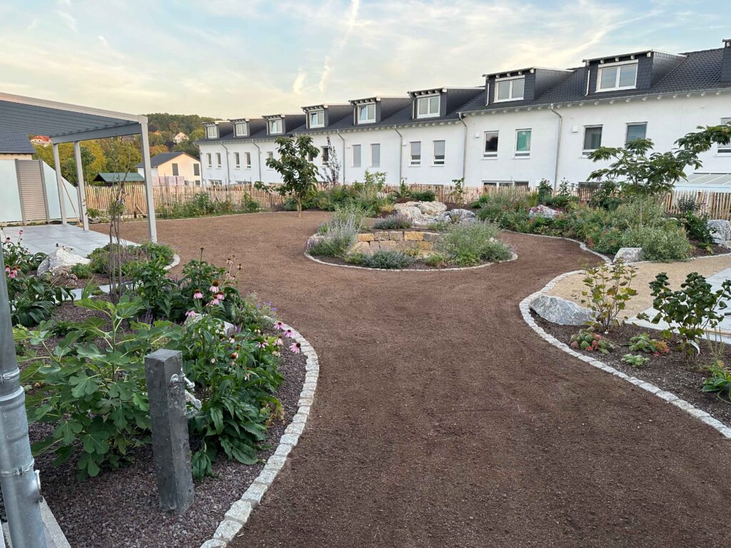 Mitten im Neubaugebiet entstand ein Garten, der moderne Gestaltung mit natürlicher Ästhetik vereint. Die Planung folgte keinem starren Raster, sondern orientierte sich an organischen Linien und der Topografie des Geländes. Das Ergebnis ist ein lebendiger Außenraum mit hohem Aufenthaltswert – naturnah, funktional und voller Atmosphäre.