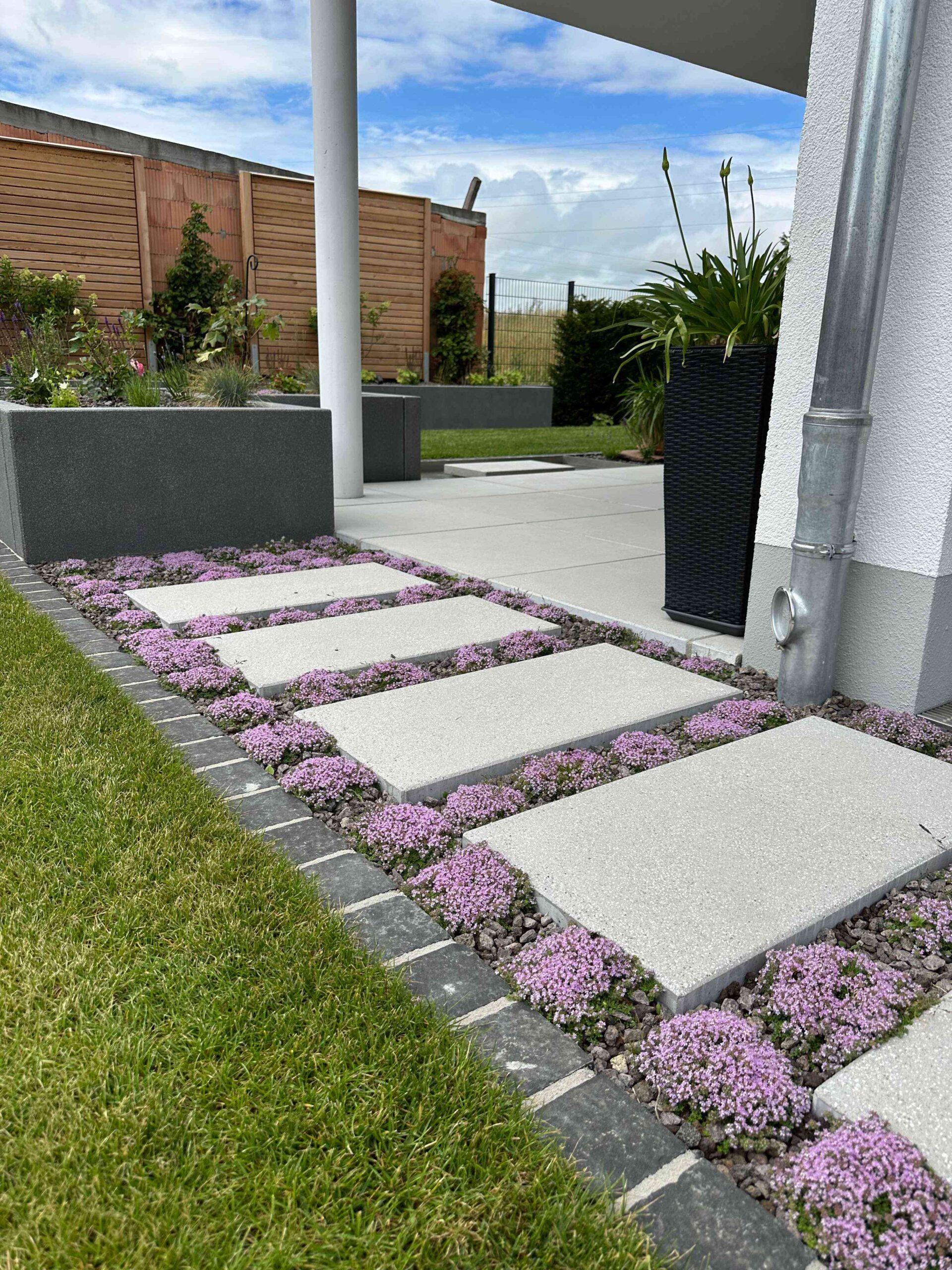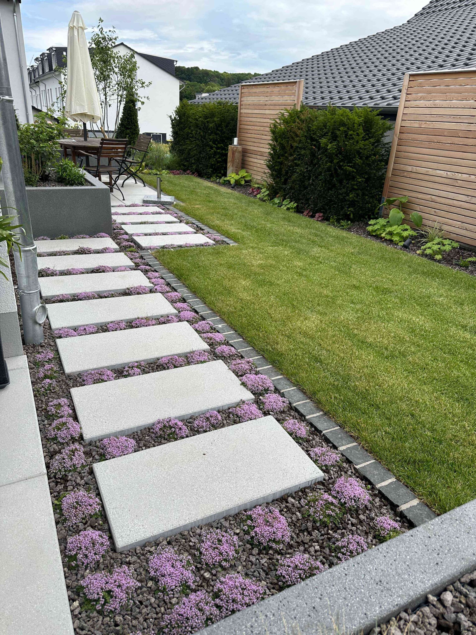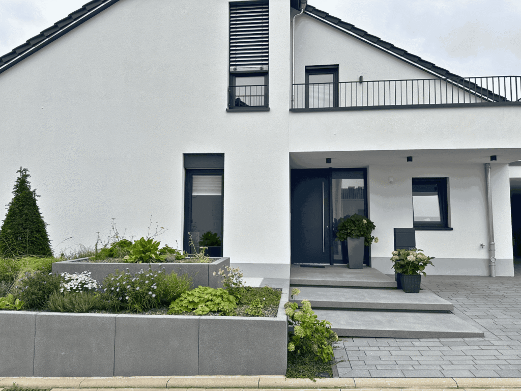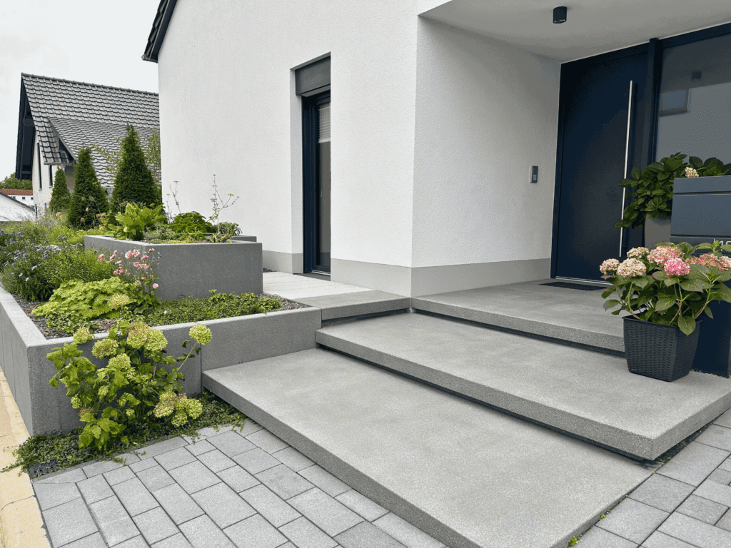 Schon beim Betreten des Gartens wird die besondere Gestaltung spürbar: Eine Schwebestufenanlage aus großformatigen Betonplatten führt elegant durch den Eingangsbereich. Die präzise Ausführung und das reduzierte Design vermitteln Leichtigkeit und Geradlinigkeit.