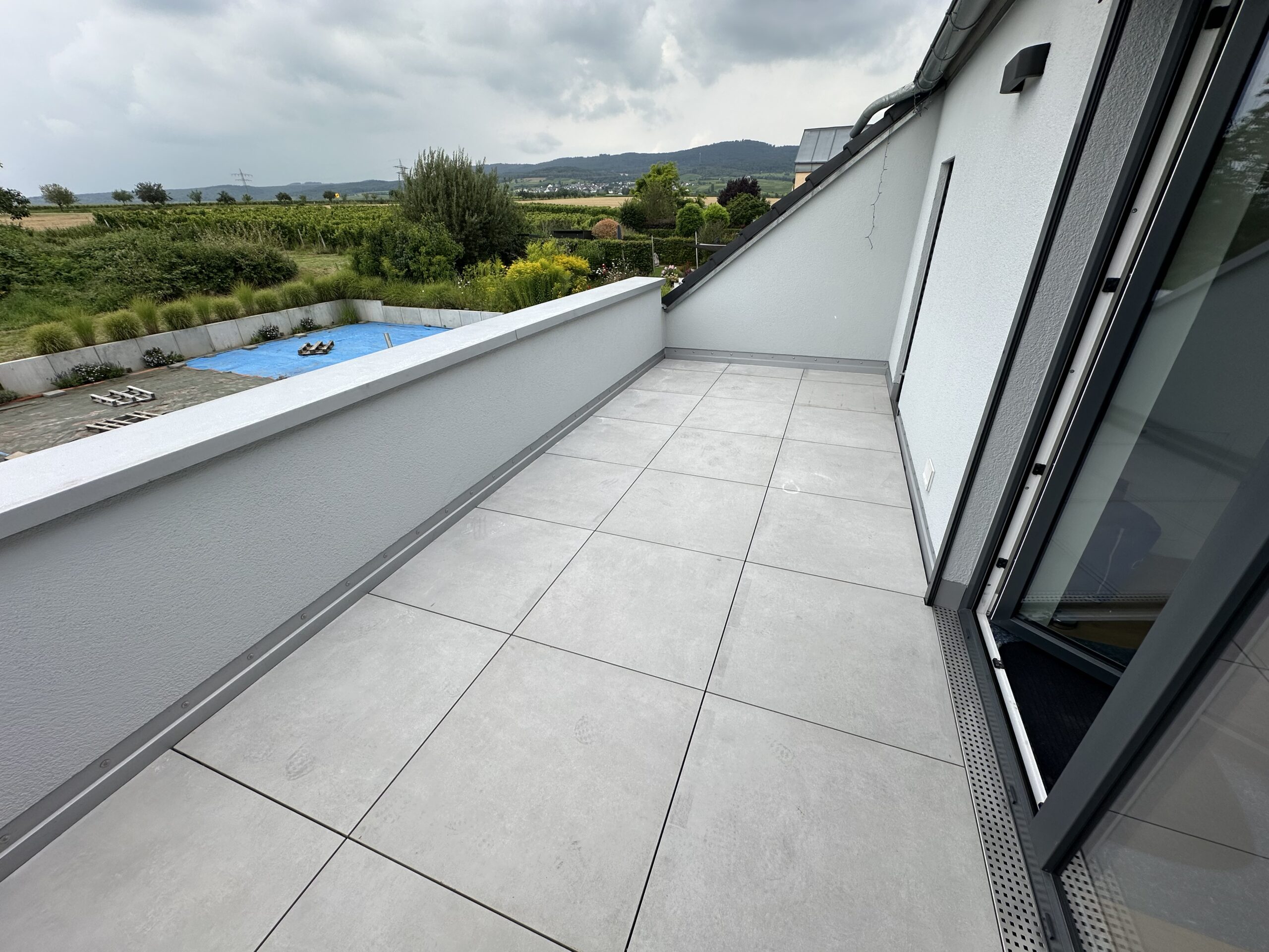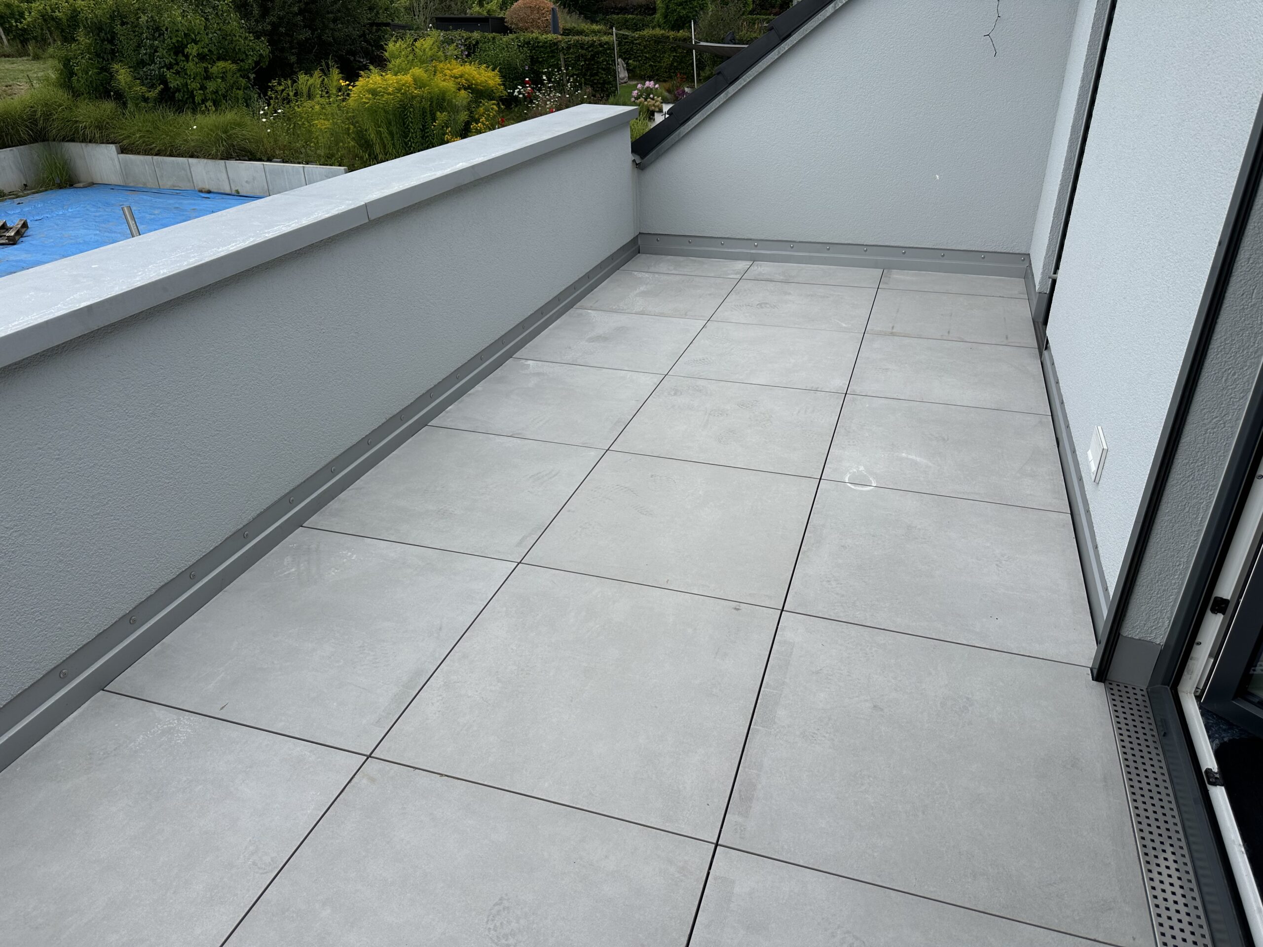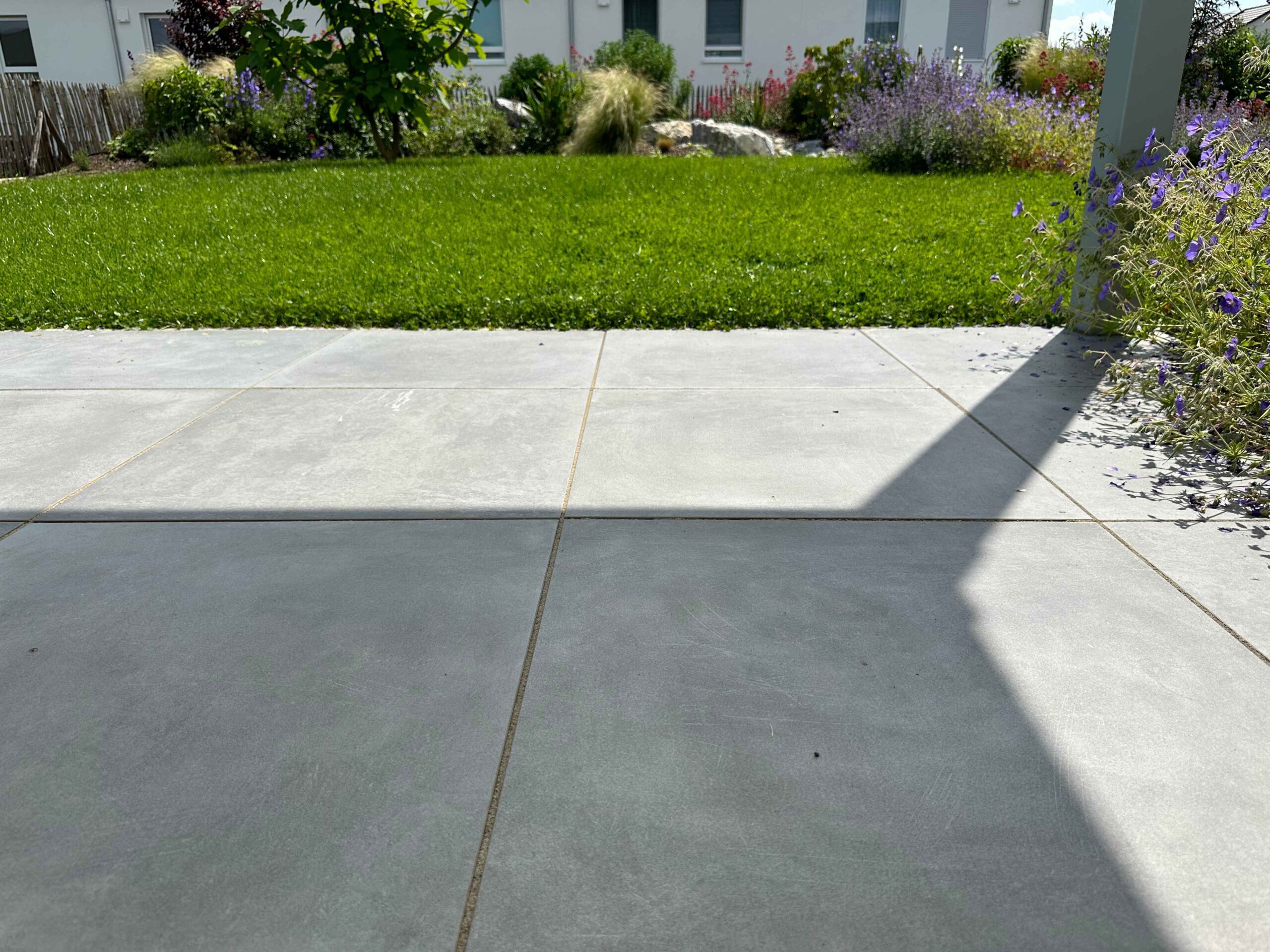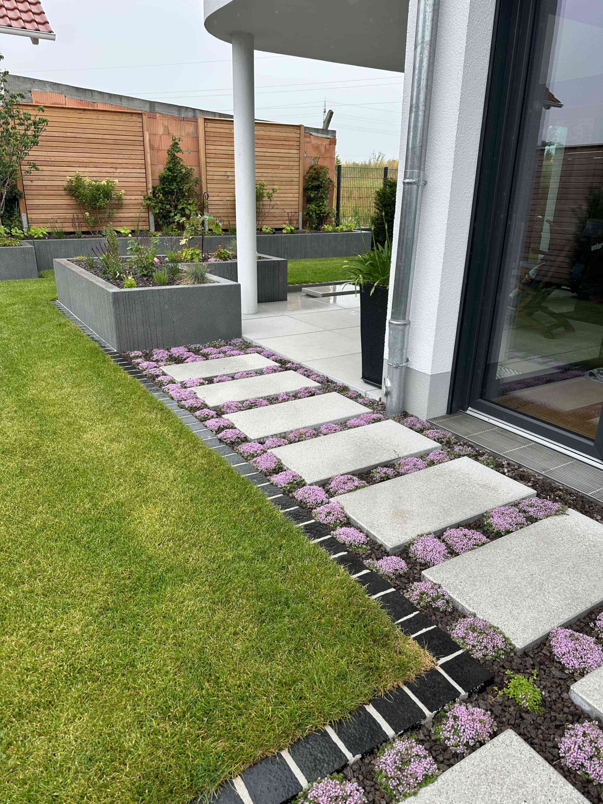 Schon beim Betreten des Gartens wird die besondere Gestaltung spürbar: Eine Schwebestufenanlage aus großformatigen Betonplatten führt elegant durch den Eingangsbereich. Die präzise Ausführung und das reduzierte Design vermitteln Leichtigkeit und Geradlinigkeit.