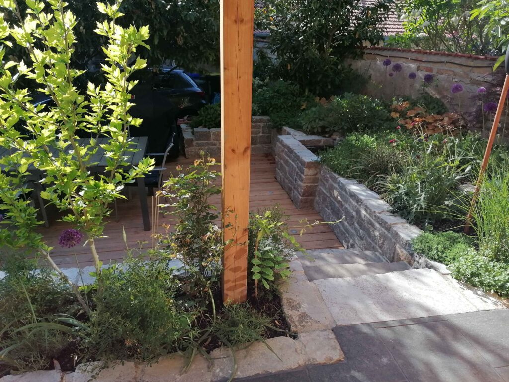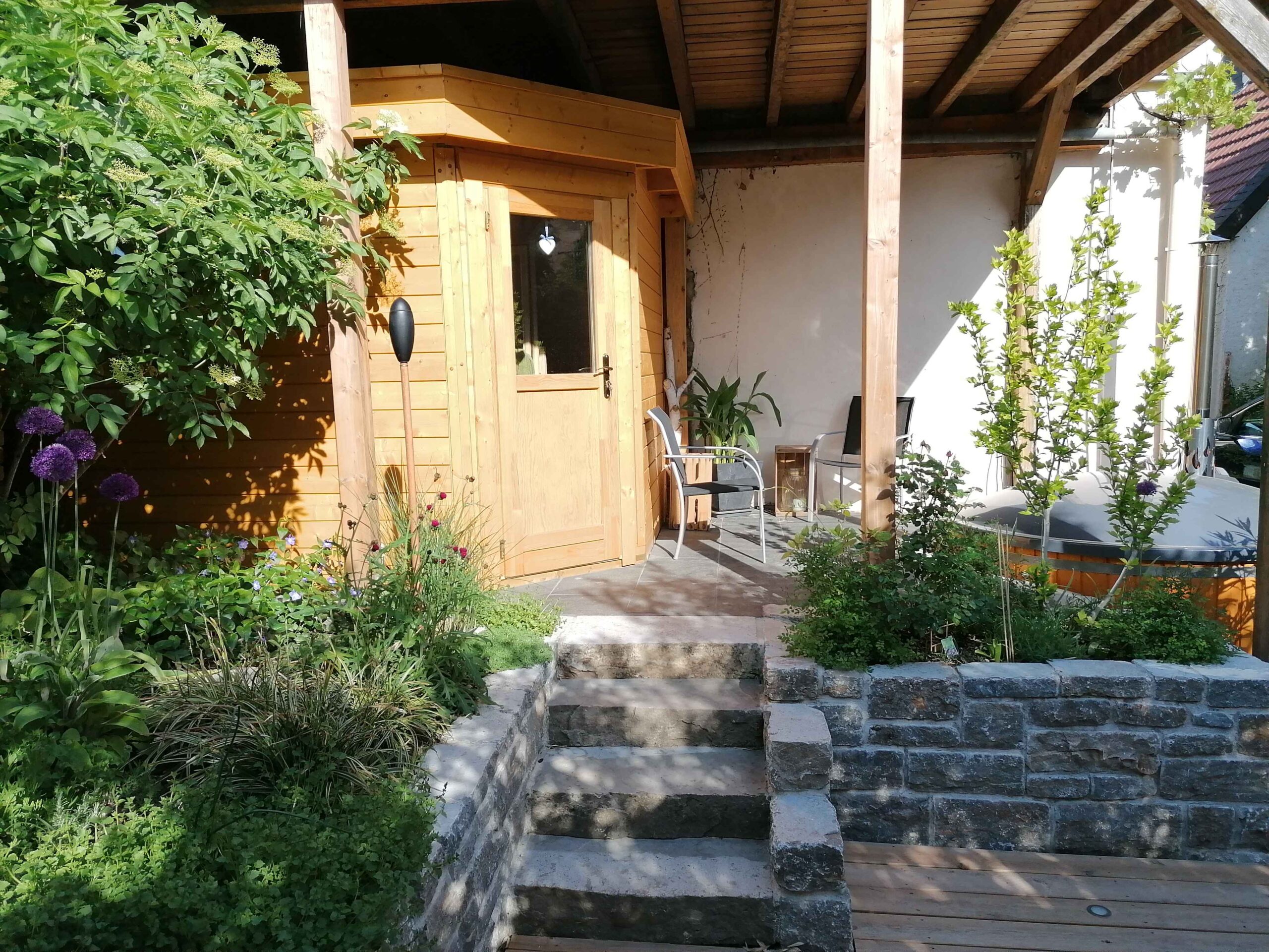 Durch den gezielten Einsatz von Natursteinmauern aus Muschelkalk entsteht eine strukturierte, aberdennoch weiche Gartengliederung. In Kombination mit der Holzterrasse entsteht ein stimmiger Materialmix,der die natürliche Wirkung des Gartens unterstreicht.