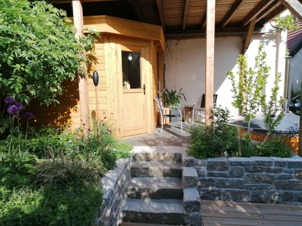 Eine kompakte Holzsauna sowie ein feuerbeheizter Hot-Tub bilden das Herzstück des Gartens. Sie ermöglichen Wellnessmomente bei jedem Wetter. Die überdachte Sitzfläche schafft einen geschützten Rückzugsort – gemütlich und funktional zugleich.