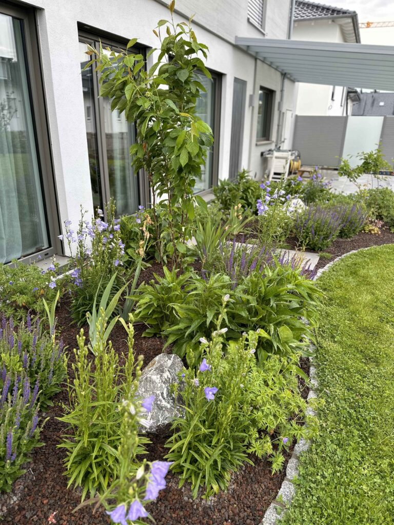 Die Wegeführung, Beetkanten und Rasenflächen sind in sanften Kurven angelegt. Dadurch wirkt der Garten fließend und großzügig – ein bewusster Kontrast zur rechtwinkligen Architektur der umliegenden Bebauung. Der Garten fügt sich damit harmonisch in die Umgebung ein und schafft gleichzeitig eine einladende, individuelle Struktur.