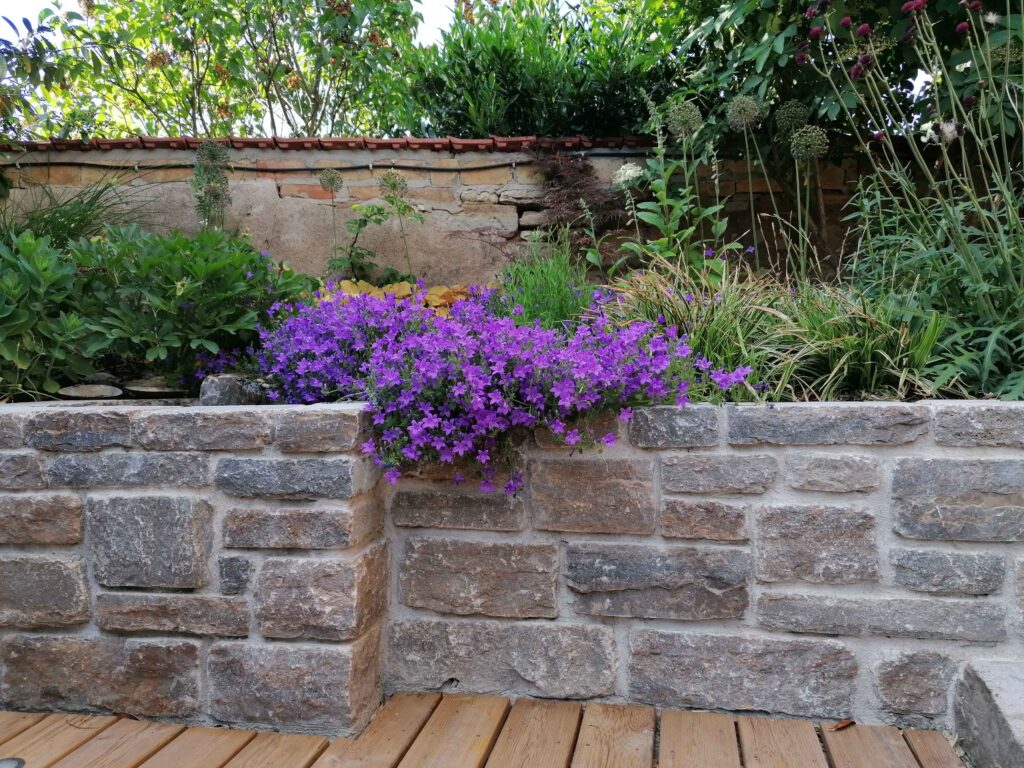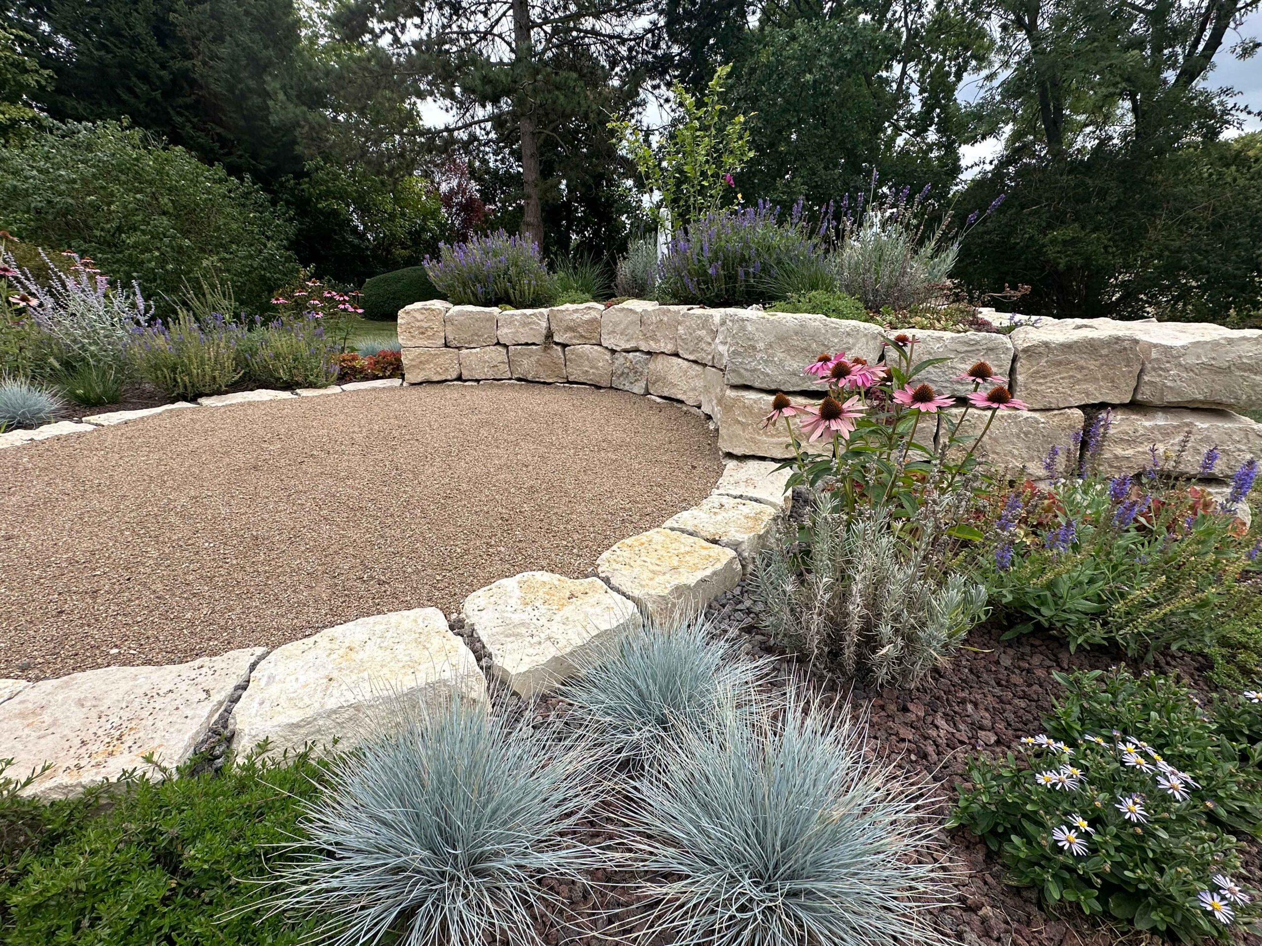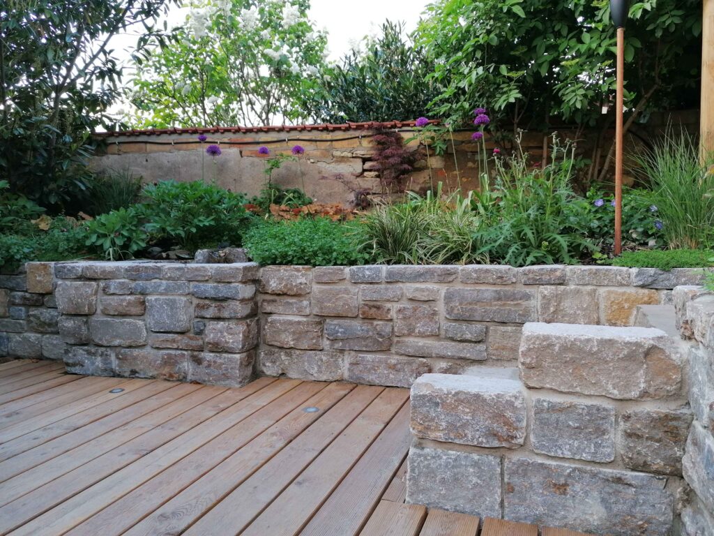 Durch den gezielten Einsatz von Natursteinmauern aus Muschelkalk entsteht eine strukturierte, aber dennoch weiche Gartengliederung. In Kombination mit der Holzterrasse entsteht ein stimmiger Materialmix, der die natürliche Wirkung des Gartens unterstreicht.