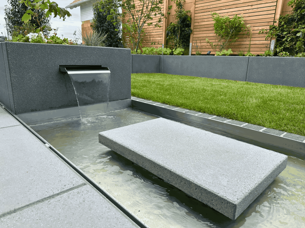 Ein kleines Wasserbecken mit integrierter Cortenstahl-Schütte sorgt für ein ruhiges Plätschern im Hintergrund. Der feine Klang und die spiegelnde Wasseroberfläche schaffen eine beruhigende Atmosphäre. Gleichzeitig dient das Becken als Trink- und Badestelle für Insekten und Vögel – ein lebendiges Detail mit ökologischem Mehrwert.