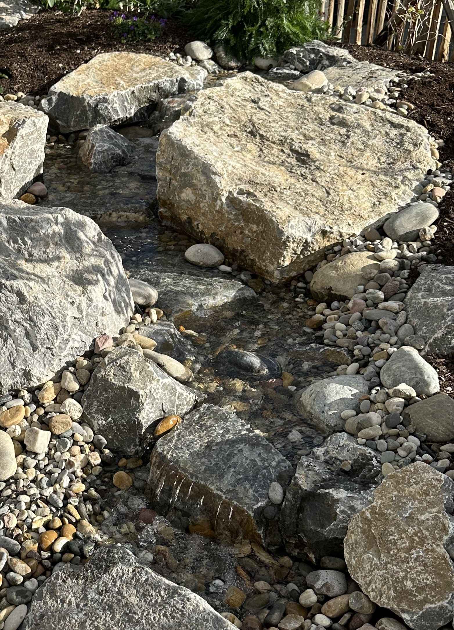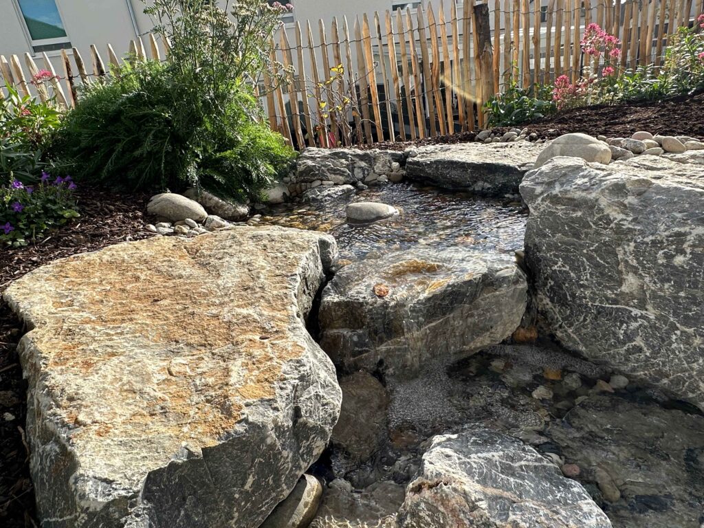 Ein in die Gestaltung integrierter Bachlauf fließt leicht plätschernd durch den Garten. Große Findlinge, kleineKiesel und eine durchdachte Wasserführung machen ihn zu einem optischen Highlight – und zu einemlebendigen Biotop für Insekten und Vögel. Gleichzeitig sorgt das Wasser für eine beruhigende Atmosphäre.