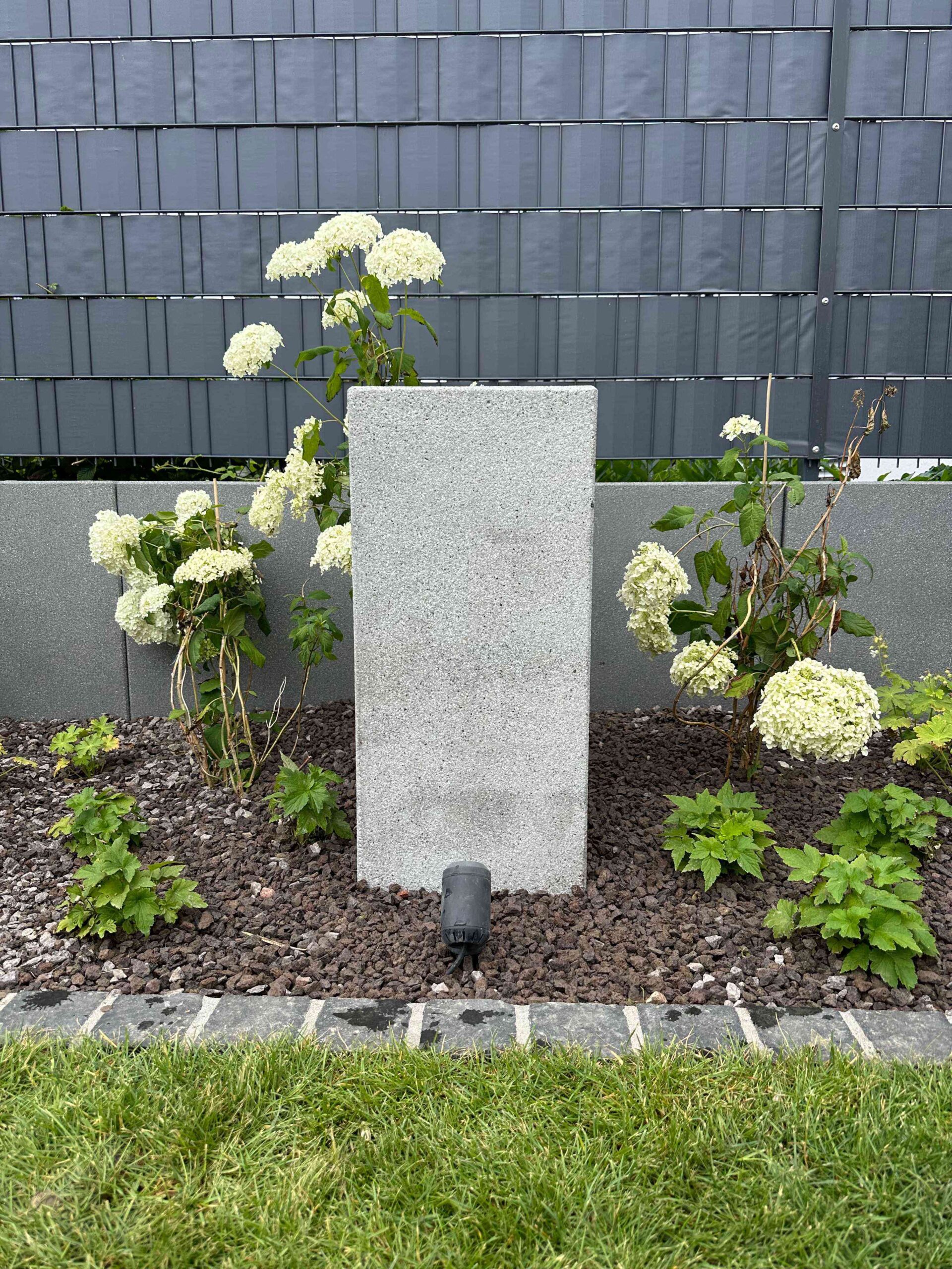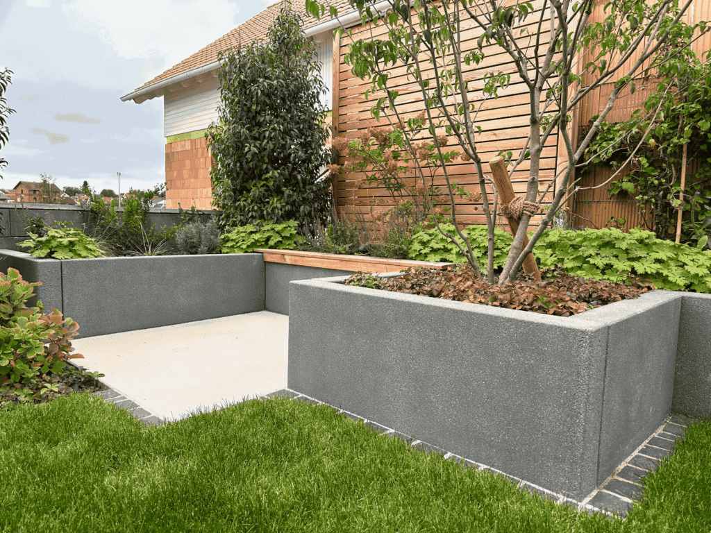 Zur Gliederung des Gartens und zur Gestaltung von Höhenunterschieden wurden individuell gefertigte Hochbeete aus Betonstehlen eingebaut. Sie dienen als stilvolle Raumtrenner und unterteilen den Garten in verschiedene Gartenräume. So entsteht eine klare Struktur, die Orientierung gibt und gleichzeitig gestalterische Tiefe schafft.