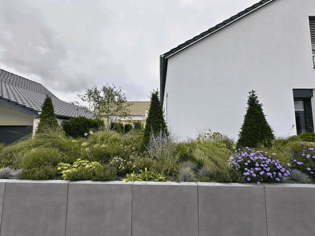 Üppige Pflanzbereiche und liebevoll kombinierte Stauden schaffen Farbe und Struktur. Die Bepflanzung ist pflegeleicht, ökologisch wertvoll und bringt Bewegung in den Garten – passend zum ruhigen, klaren Design.