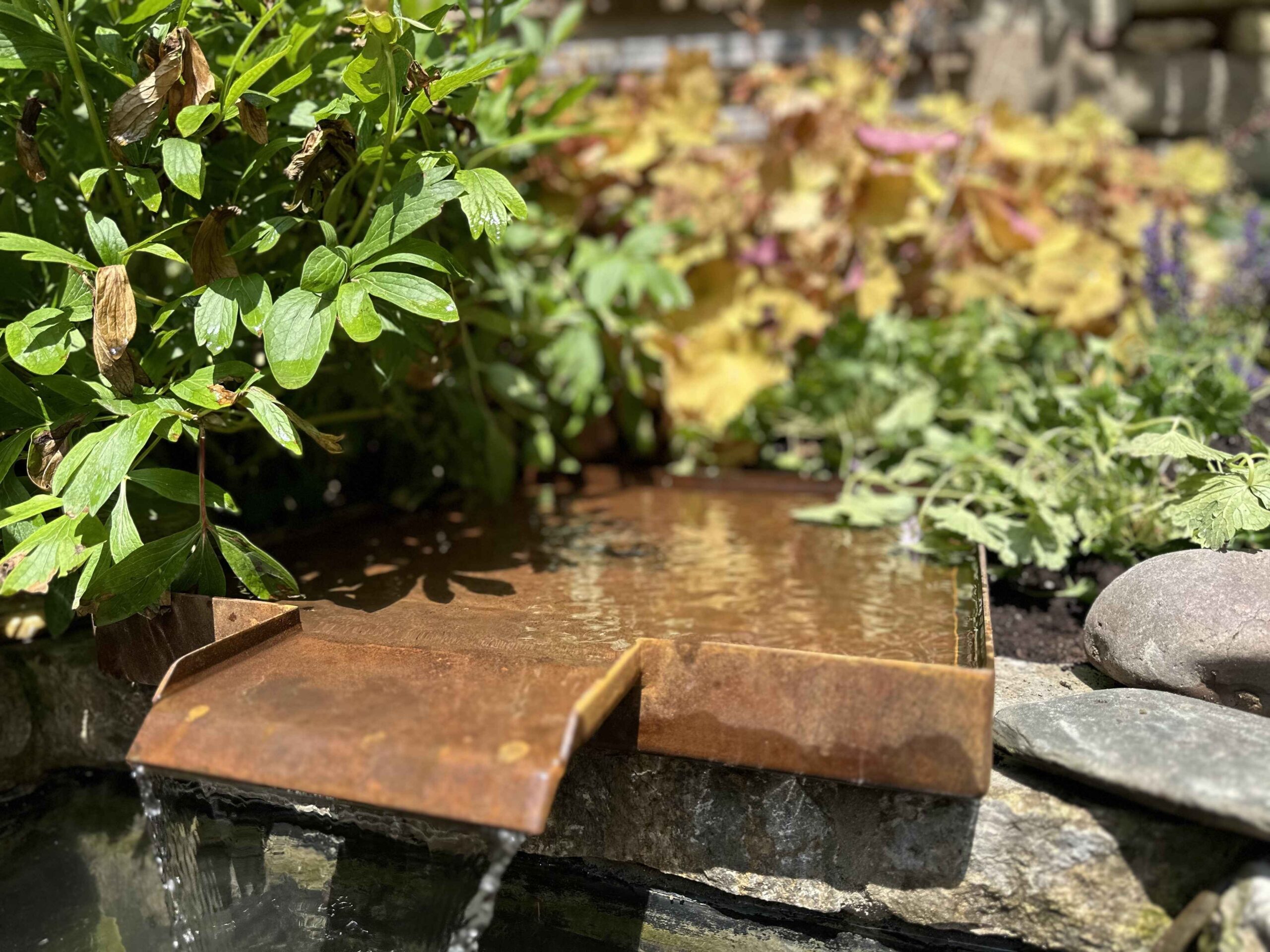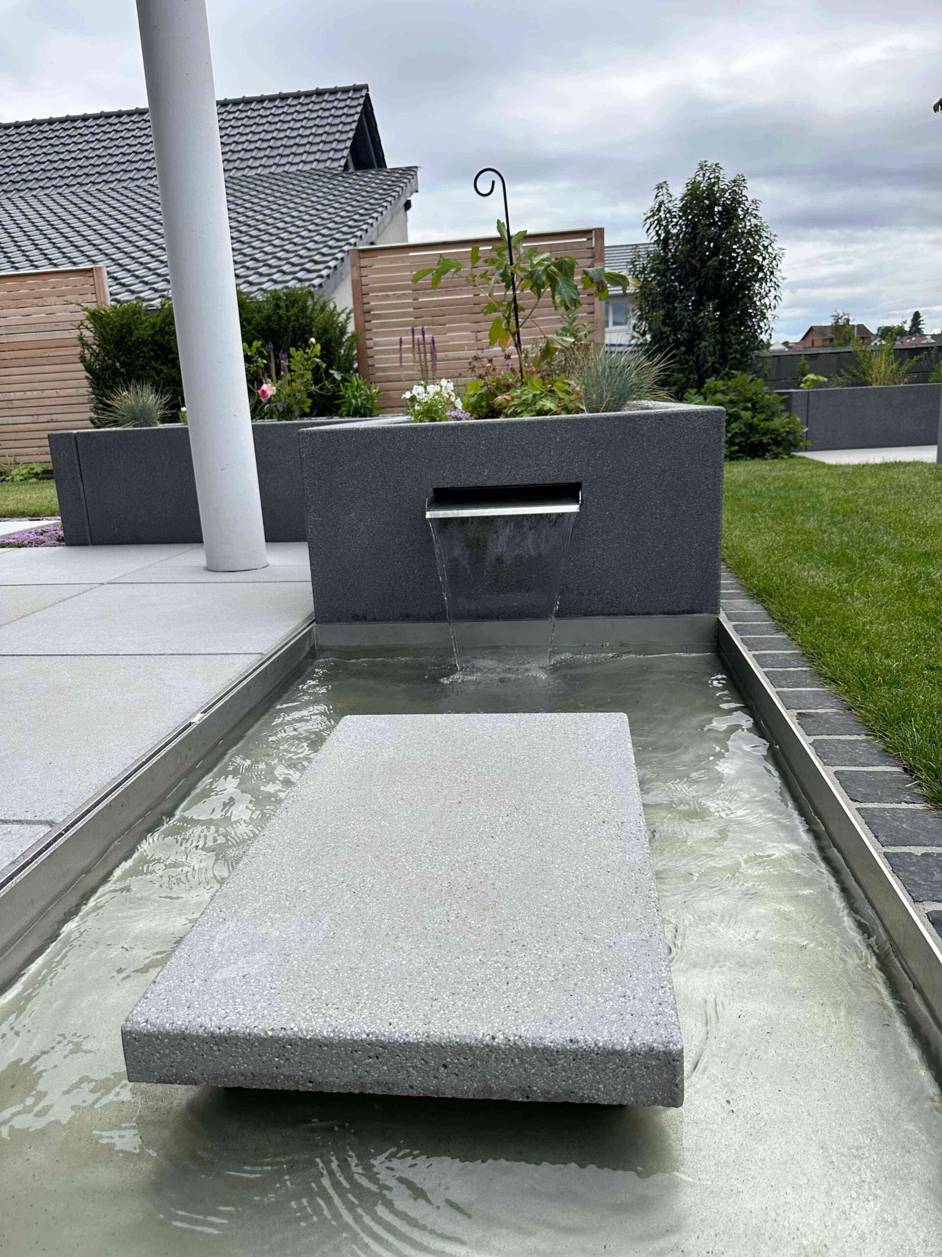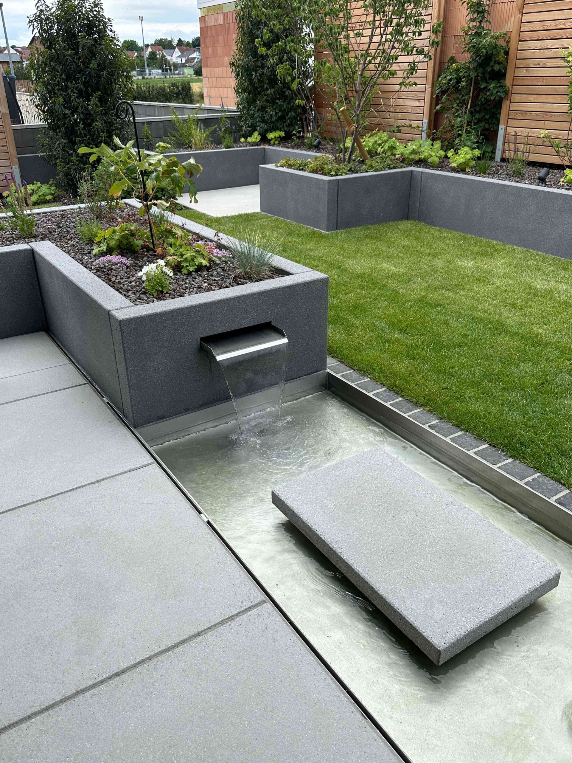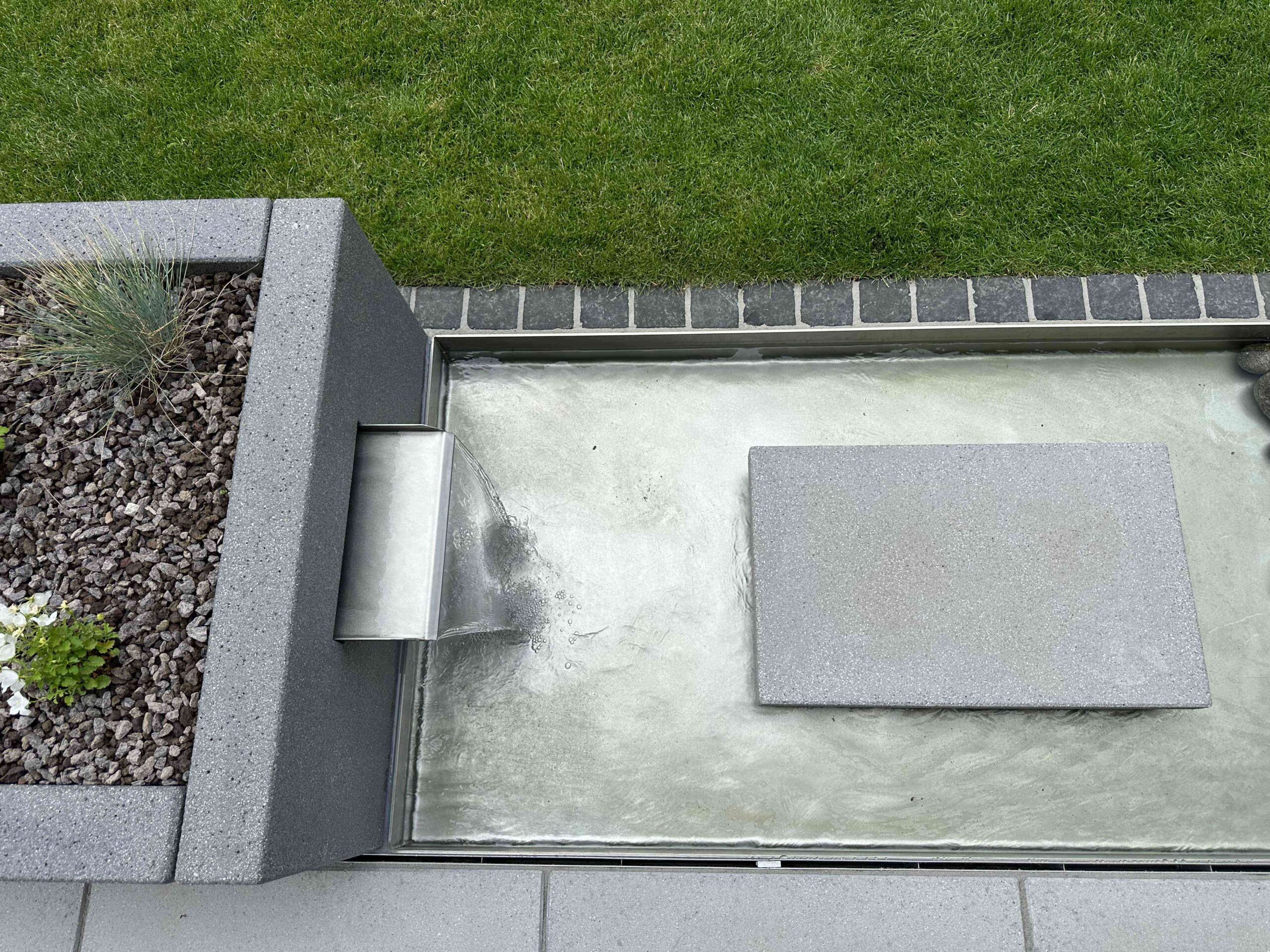 Ein kleines Wasserbecken mit integrierter Cortenstahl-Schütte sorgt für ein ruhiges Plätschern imHintergrund. Der feine Klang und die spiegelnde Wasseroberfläche schaffen eine beruhigende Atmosphäre.Gleichzeitig dient das Becken als Trink- und Badestelle für Insekten und Vögel – ein lebendiges Detail mitökologischem Mehrwert.