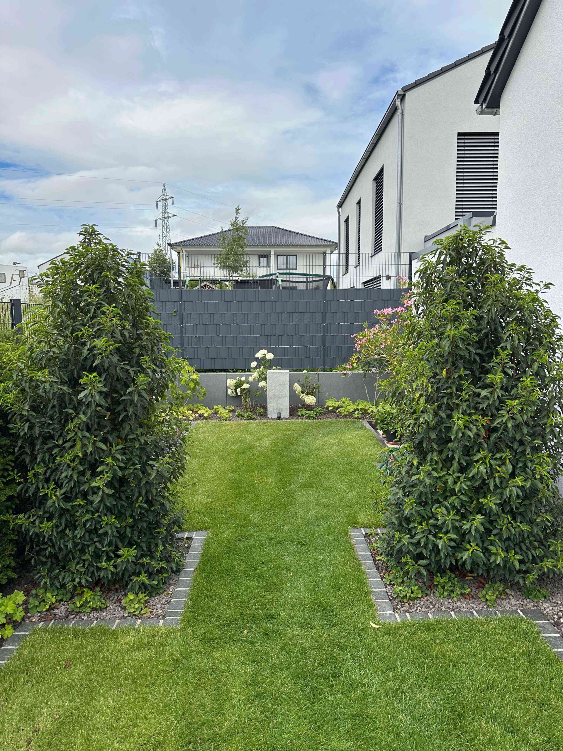 Die Wegeführung, Beetkanten und Rasenflächen sind in sanften Kurven angelegt. Dadurch wirkt der Gartenfließend und großzügig – ein bewusster Kontrast zur rechtwinkligen Architektur der umliegenden Bebauung.Der Garten fügt sich damit harmonisch in die Umgebung ein und schafft gleichzeitig eine einladende,individuelle Struktur.