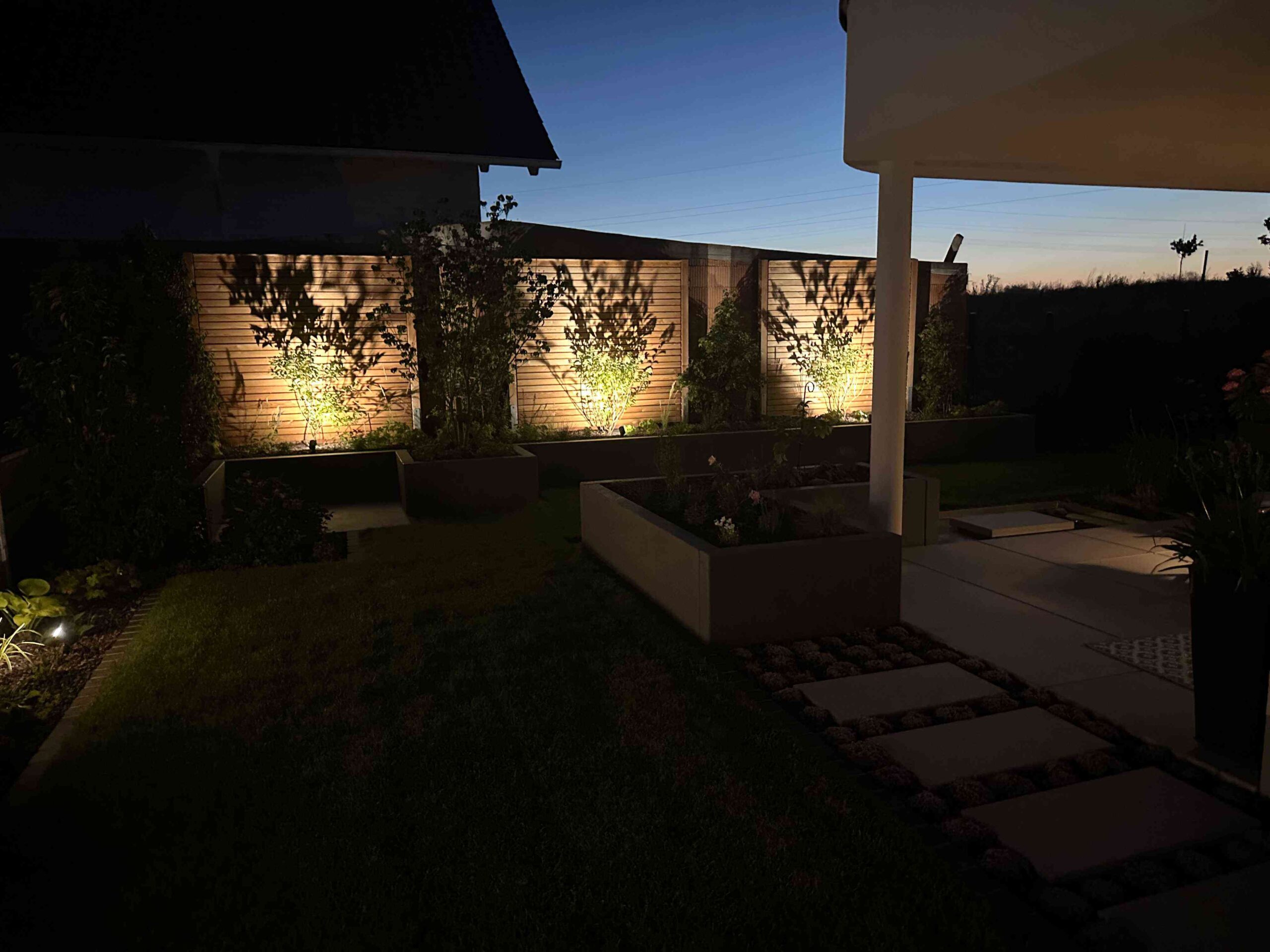 Dieses Gartenprojekt steht für moderne Gestaltung auf höchstem Niveau. Von der ersten Idee bis zur finalen Umsetzung entstand ein einzigartiger Außenraum, der exakt auf die Wünsche des Kunden zugeschnitten wurde. Das Ergebnis ist ein klar strukturierter, ästhetischer Garten mit hoher Aufenthaltsqualität – bei Tag und bei Nacht.