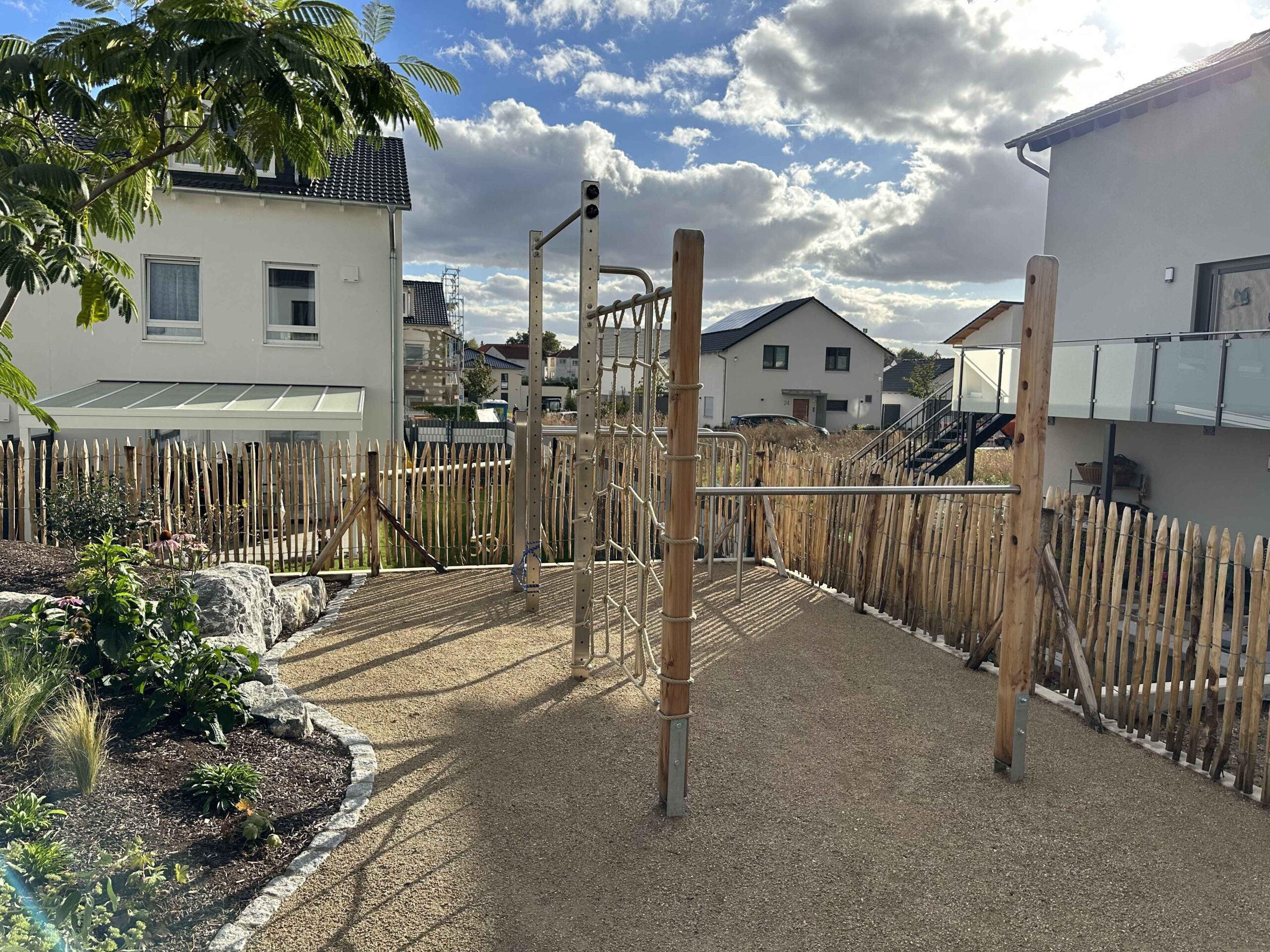 Ein eigener Bereich mit Kletter- und Fitnessgeräten ergänzt den Garten um eine aktive Komponente. Der naturnahe Spiel- und Bewegungsbereich spricht Kinder wie Erwachsene gleichermaßen an – eingebettet in die Gesamtgestaltung und ausgeführt mit hochwertigen Materialien.