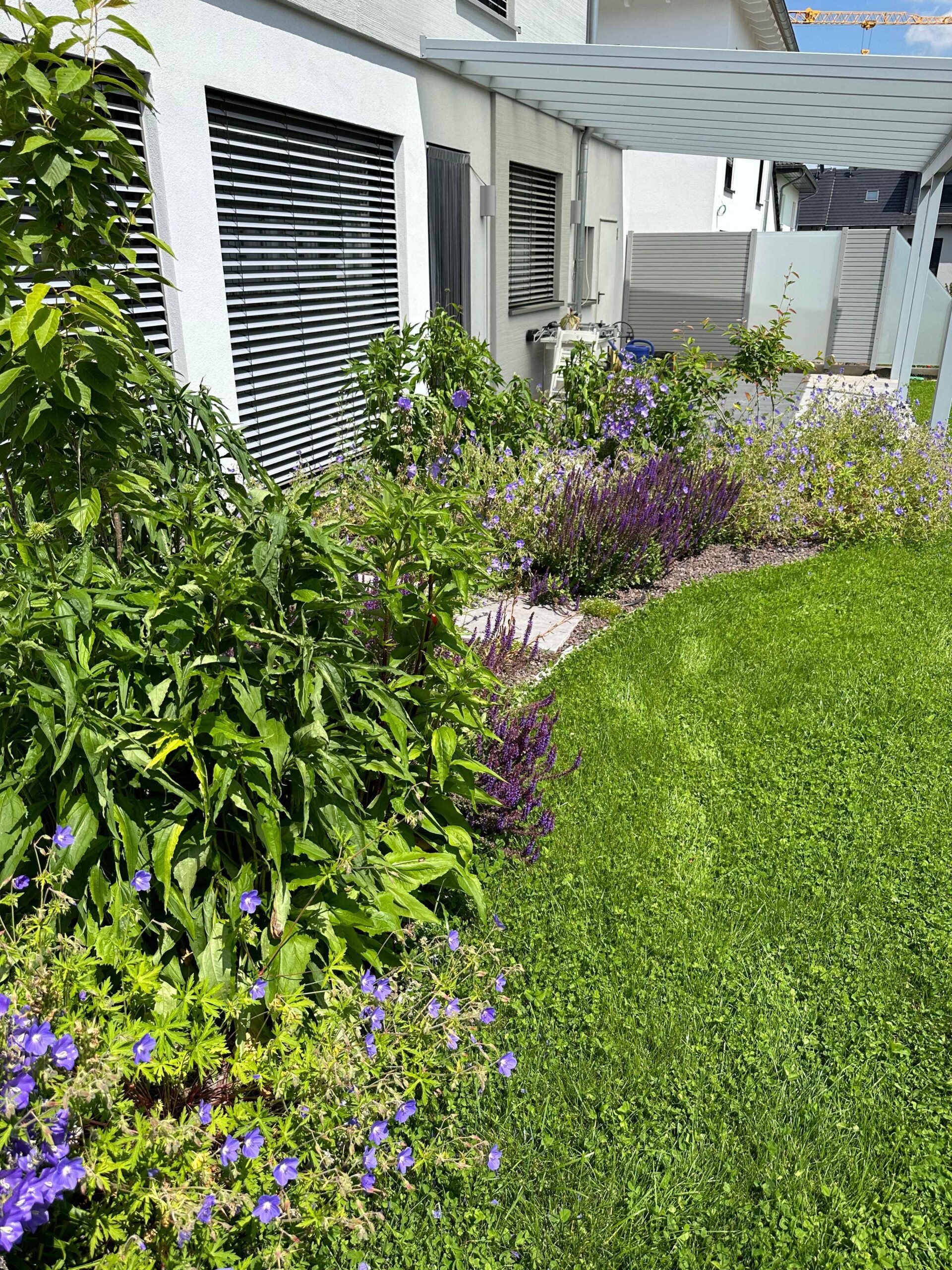 Statt herkömmlichem Rasen kommt ein spezieller Kleerasen zum Einsatz. Er ist nicht nur optisch attraktiv, sondern auch deutlich widerstandsfähiger gegenüber Trockenheit. Gleichzeitig benötigt er weniger Pflege und Wasser – eine nachhaltige Lösung für moderne Gärten.