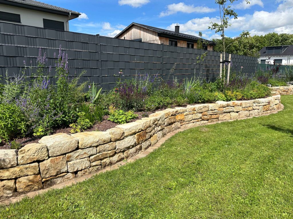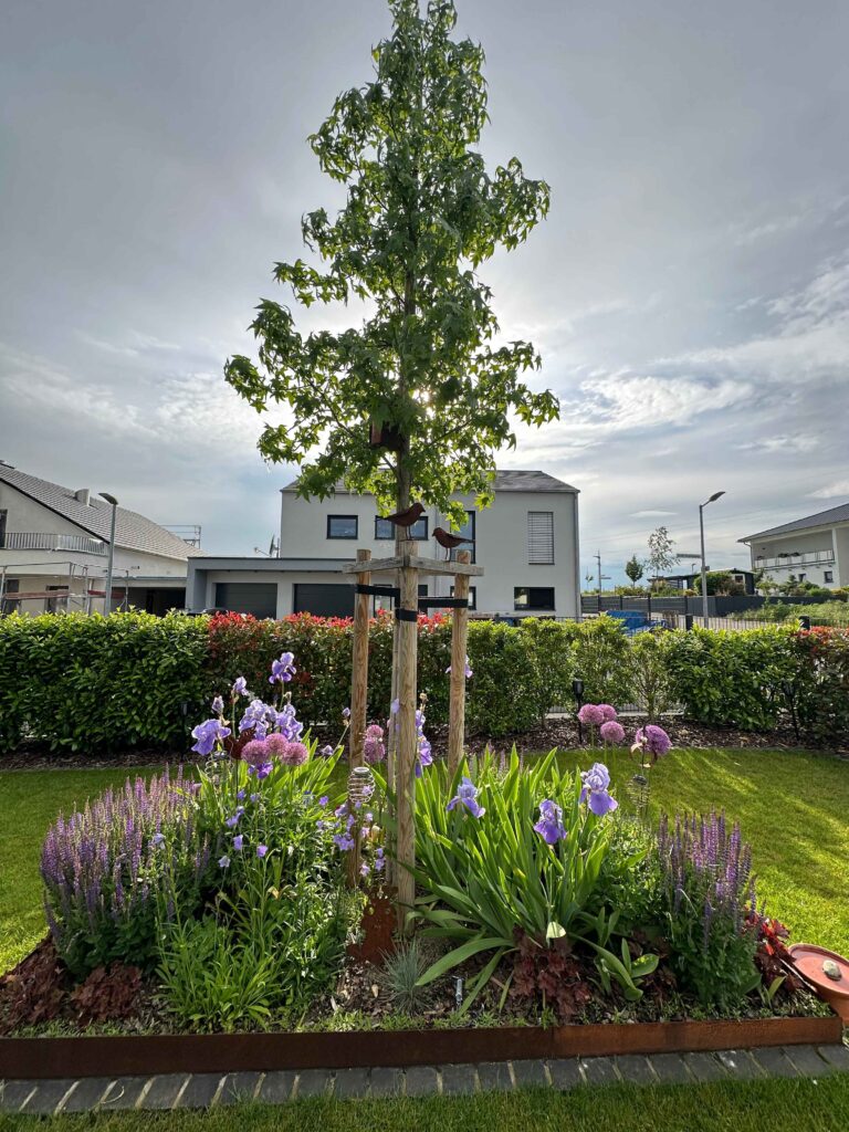 Dabei setzen wir häufig auf heimische und insektenfreundliche Stauden, die nicht nur optisch überzeugen, sondern auch einen wertvollen Beitrag zur Biodiversität leisten. Ebenso pflanzen wir Hecken, Solitärsträucher und Bäume – bis hin zu Großgehölzen, die Ihrem Garten Struktur und Charakter verleihen.