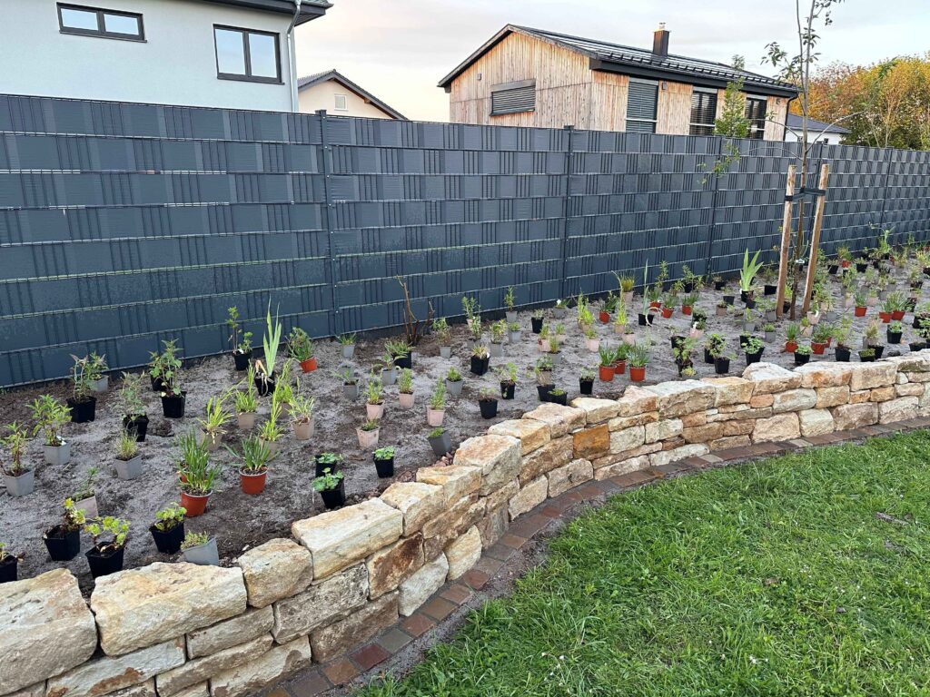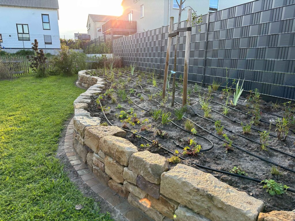 Im nächsten Schritt werden die Stauden fachgerecht eingepflanzt. Bei Bedarf wird zusätzlich eine Tröpfchenbewässerung installiert. Diese erleichtert die Pflege in der Anfangszeit, da das regelmäßige Gießen per Hand entfällt und die jungen Pflanzen zuverlässig versorgt werden.