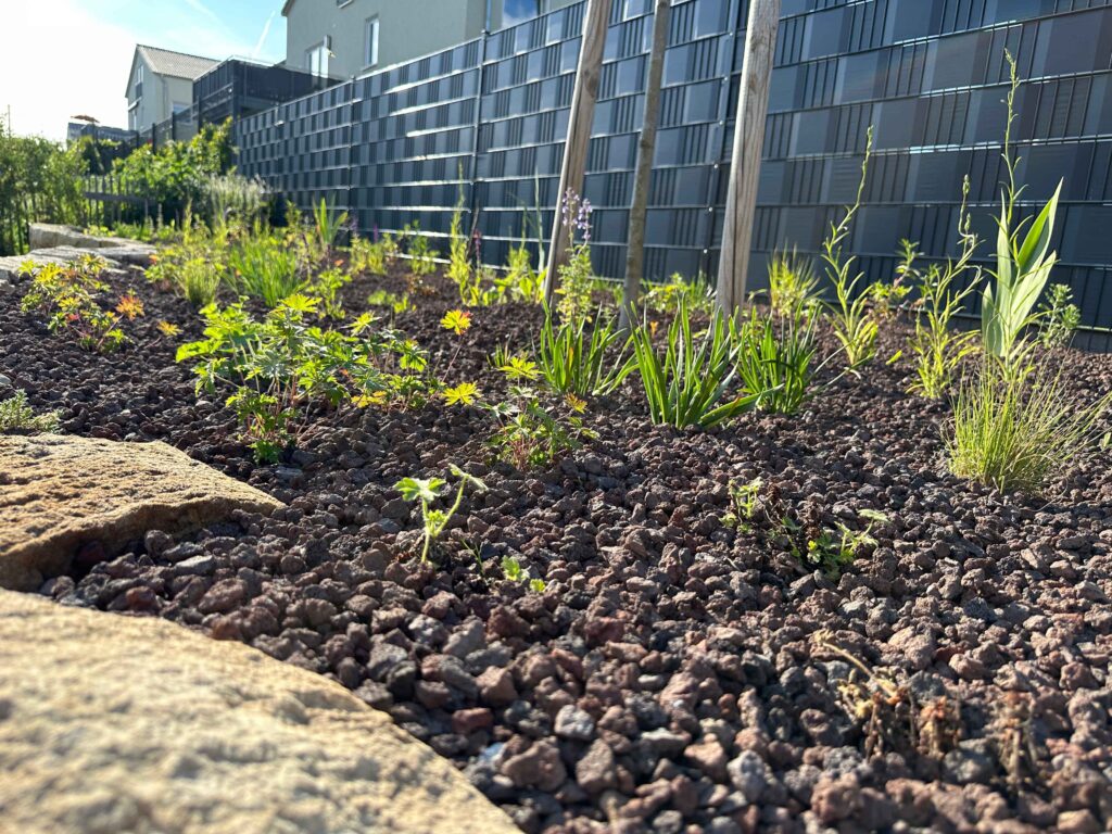 Nach der Pflanzung wird die Fläche mit einer etwa 5-7 cm starken Schicht Lavamulch abgedeckt. Der Mulch schützt den Boden vor Austrocknung, speichert Wasser, reduziert den Unkrautwuchs und sorgt für ein dauerhaft gepflegtes Erscheinungsbild. Im Gegensatz zu Rindenmulch ist Lavamulch dauerhaft stabil und muss nicht regelmäßig erneuert werden.